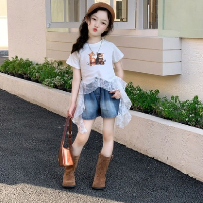 # 상하셋, 투피스, 레이스티셔츠+리본데님반바지set